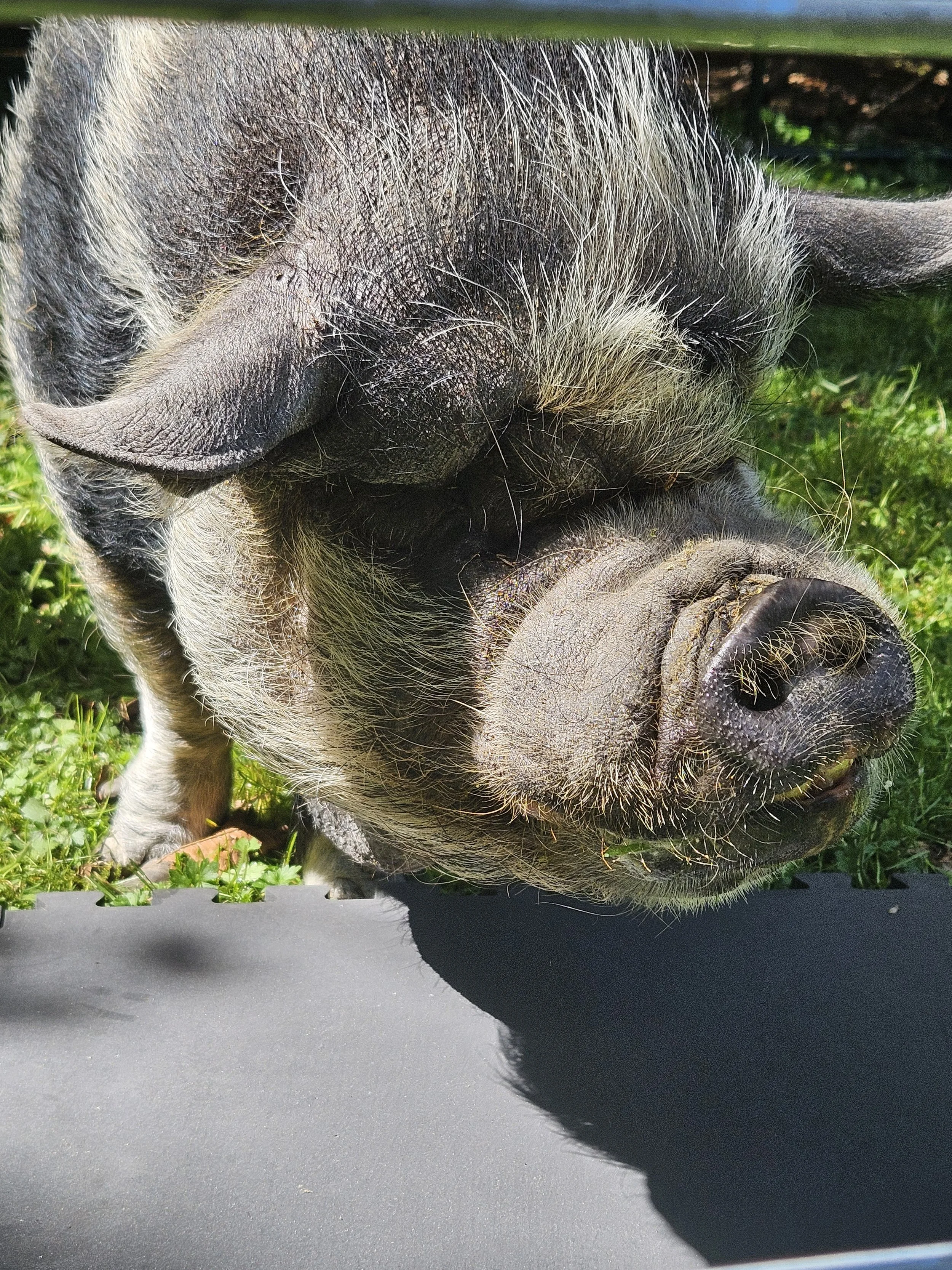 Wilburt- along with his BFF (?) Rosie-came to us in April 2025 from Heartwood Haven Animal Sanctuary in Roy, WA. Thought to be about 10+ years old, he is deaf and blind, probably as a result of obesity before he was rescued, but his sense of smell is awesome! He has slimmed down (though he refuses to get on a scale) and is enjoying having room to root and graze here on Dragonfly Farms. He is easy-going and loves his belly rubs.