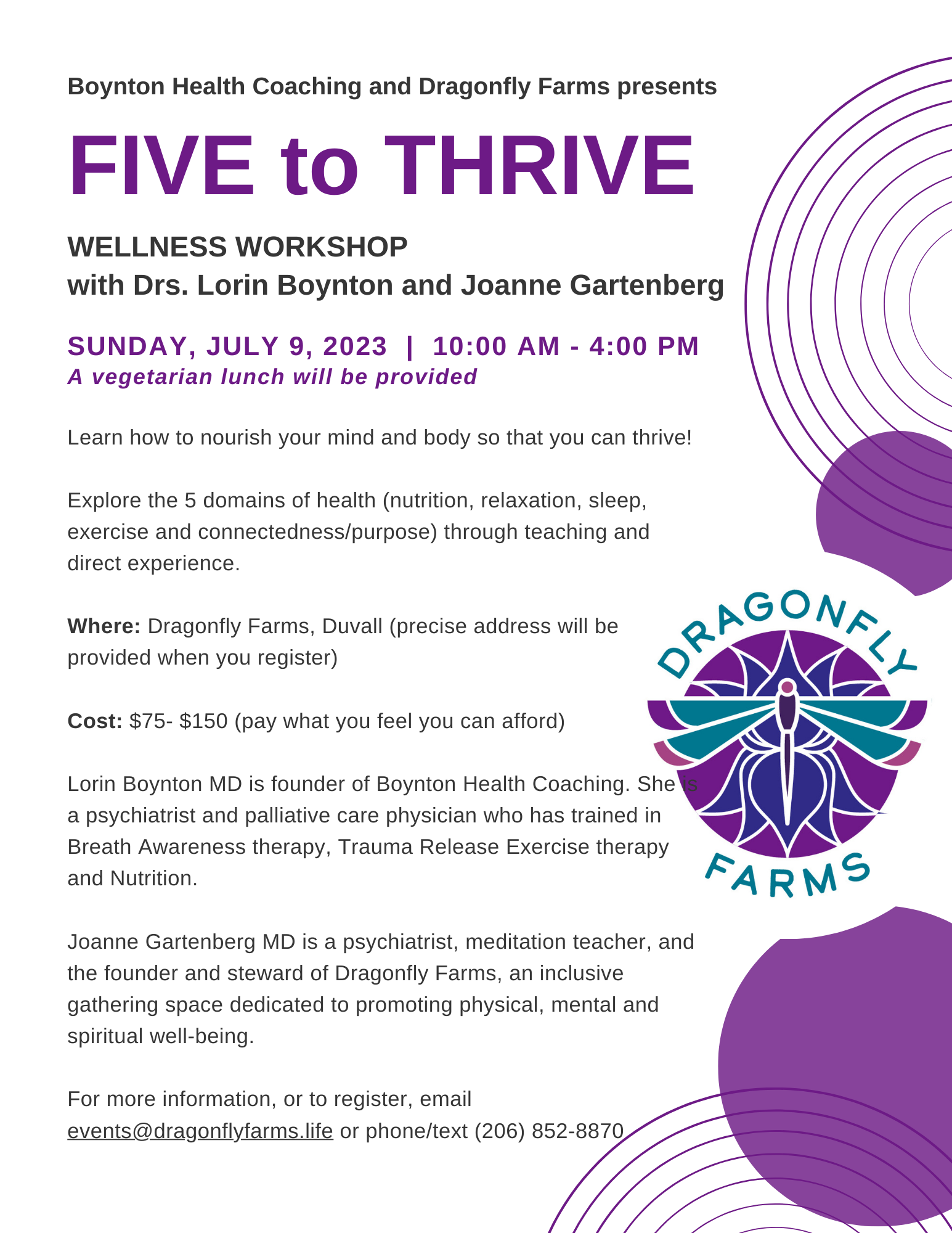 “Five to Thrive” was a wellness workshop with Drs. Lorin Boynton and Joanne Gartenberg, where we explored the 5 domains of health (nutrition, relaxation, sleep, exercise and connectedness/purpose) through teaching and direct experience.